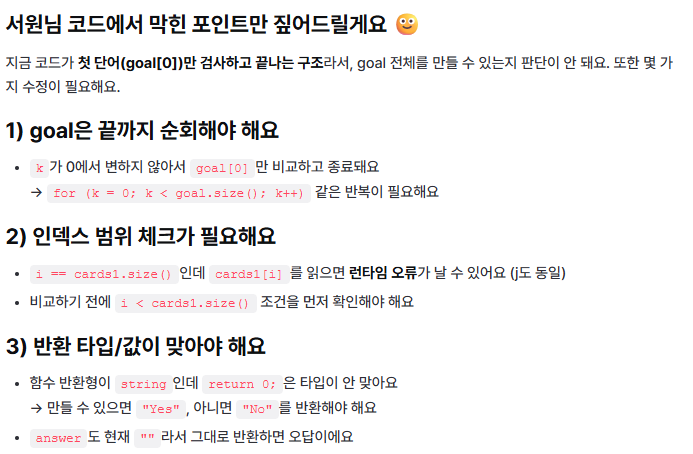 string solution(vector<string> cards1, vector<string> cards2, vector<string> goal) {